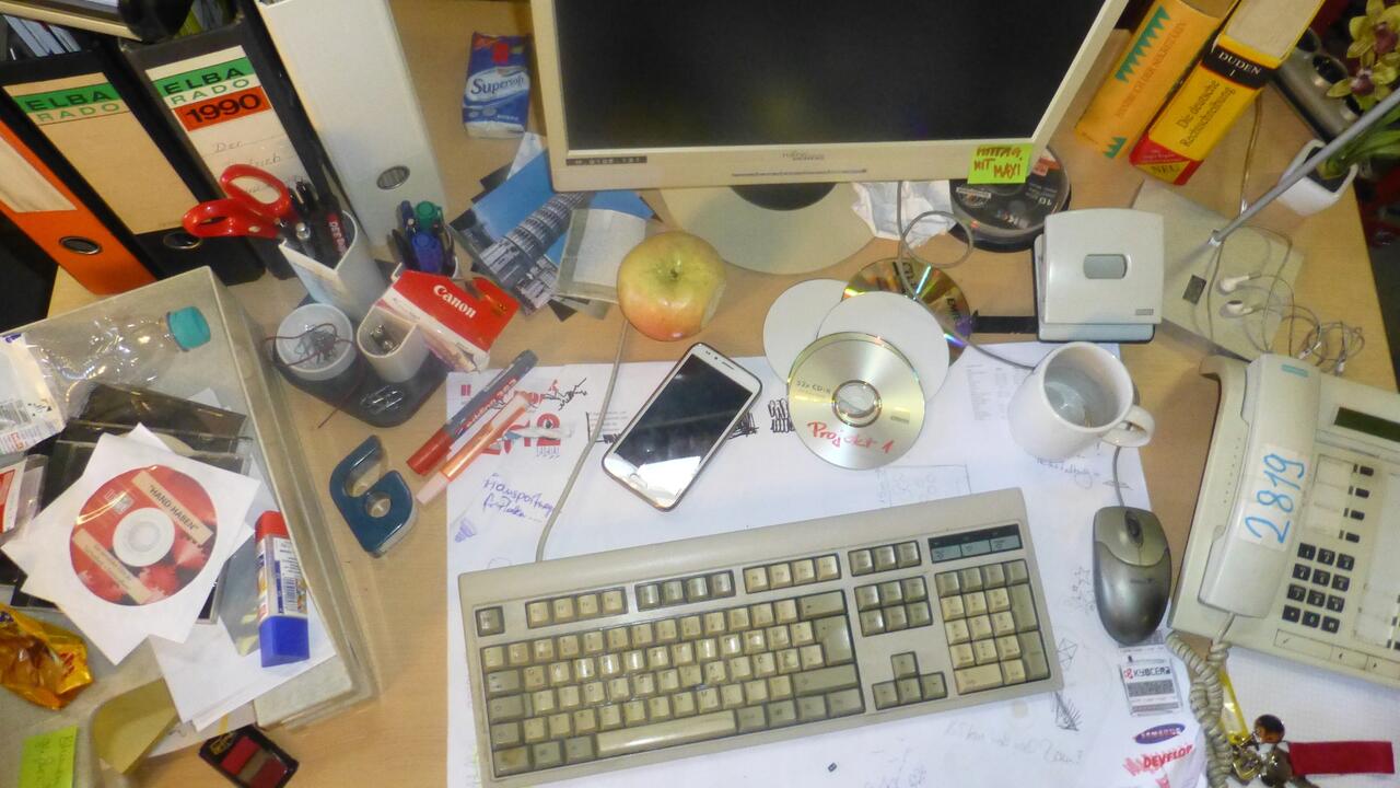 Über den Bildschirm wird ein Video projiziert. Auf der Ansichtskarte ist eine Intranet-Adresse notiert. Dort befinden sich Leitfragen zur eigenen Arbeitsgestaltung und Bestellmöglichkeiten für Ordnungssysteme.