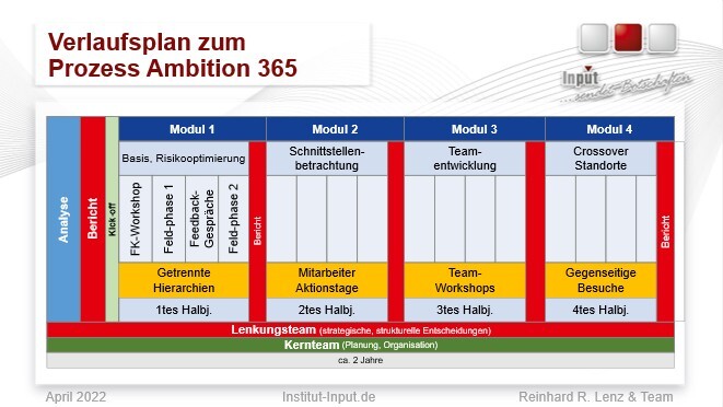 Ambition 365 ist ein modular aufgebauter Prozess zur Entwicklung einer Präventionskultur unter Einbeziehung alle Hierarchieebenen. Es handelt sich nicht um ein “Projekt“ mit definiertem Anfang und Ende, sondern um einen kontinuierlichen, offenen “Prozess“.